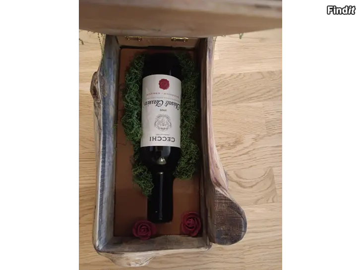 Handgjord vinlåda i äkta trä, ett unikt artesan-hantverk dekorerat med mossa, rosor och ett spelande piano.