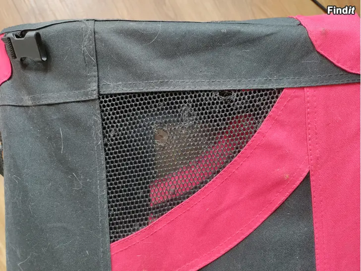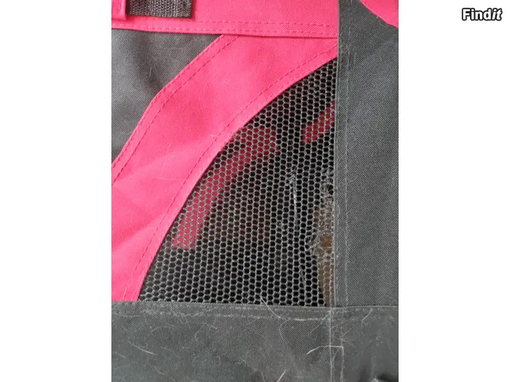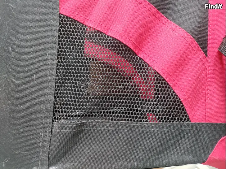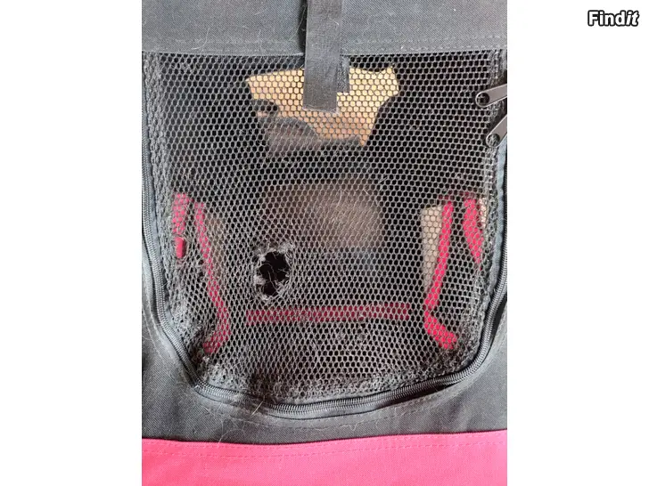 Canvasbur lämplig för mindre hund. Storlek M: höjd 42 cm, längd 60 cm, bredd 42 cm. Det finns mindre hål i nätet som framgår från bilderna. Dragkedjorna fungerar. Går att fälla ihop för transport eller förvaring. 15€. Finns i Vasa. Djurhushåll.