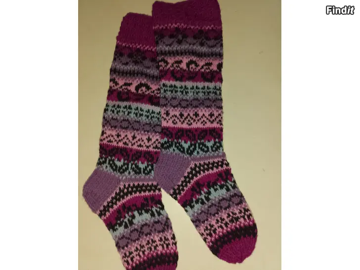Kirjoneulesukat 7 veljestä langasta. Varren mitta 38 cm ja jalkaterä 26 cm. Postikulut tarvittaessa 4e Postin S-kokoisessa paketissa manner-Suomen alueella. Samaan pakettiin mahtuu myös muutakin.
