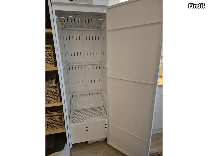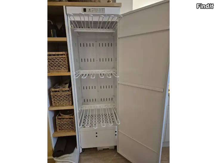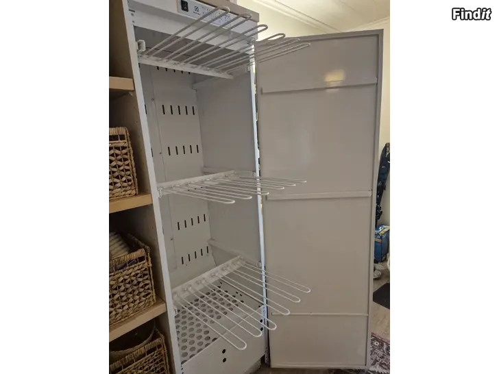 Felfritt. Torkar stora mängder kläder/lakan motsvarande 17 meter Kräver inte tillgång till vatten. Samlar kondensvatten i behållare. Höjd 195 cm Djup 61,5 cm Bredd 60 cm