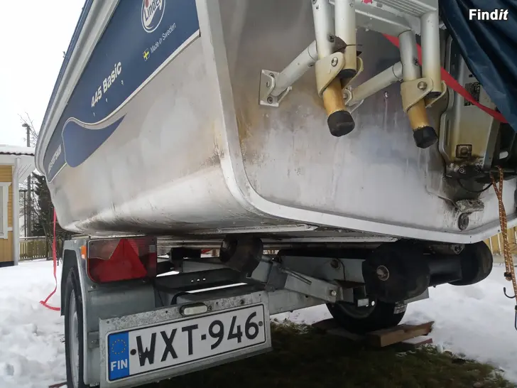 Linder 445 Basic, 20 hp Honda 4-takt, Respo trailer. Åror, Lowrance ekolod. En vattenfast Oukitel Android-tablett till navigering använt Skippo på den. Ca. 150h på motorn kamrem bytt två somrar sedan. Linders kompass-/navifäste monterad på höger sida, el draget till den.