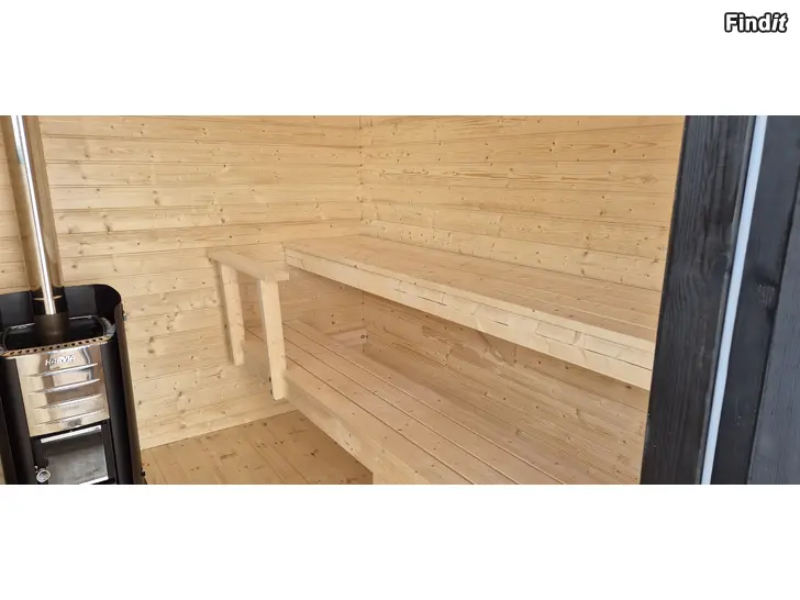 Ny bad färdig bastu med vedeldad Harvia kamin. Totalt ca 10,4 m2 med terrassen inräknad och bastu delen ca 4,6 m2. Transport ca 50km med kranbil ingår i priset.