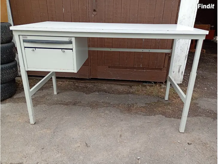 Arbetsbord med stålben och plåtlådor.