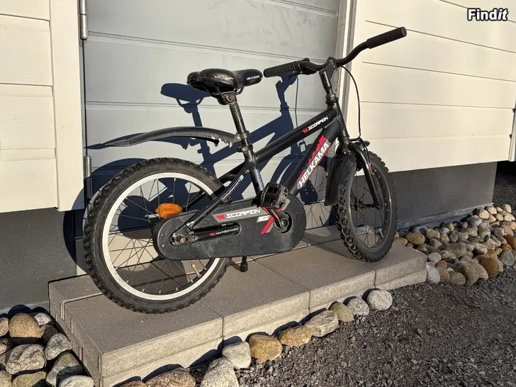 Helkama Scorpio 16” barn cykel. Kvalitets cykel som är tillverkad i Finland. Finns lite skavanker på cykeln men den är tekniskt i bra skick.