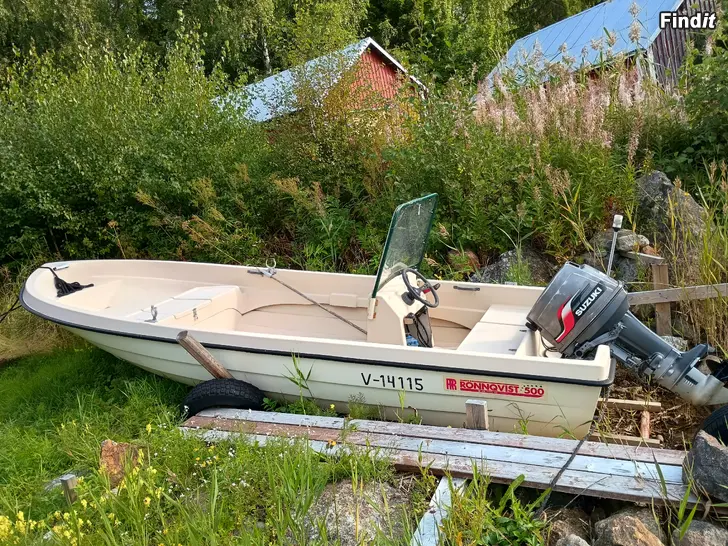rönnqvist500 längd1,80.bredd5,00.styrpulpet,vindruta.åror.suzuki30hk.3cyl.båda årsm1998..allt i bra skick.1ägare.pris4800€.tel0440880747.