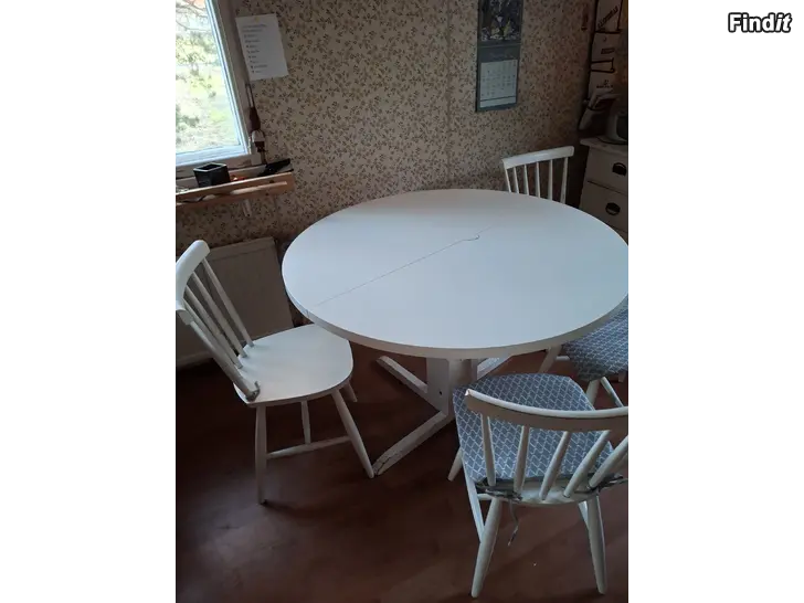 Vitt runt matbord med 4 stolar. Ett hack i mitten.