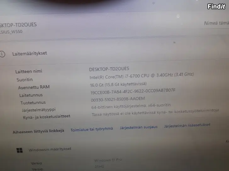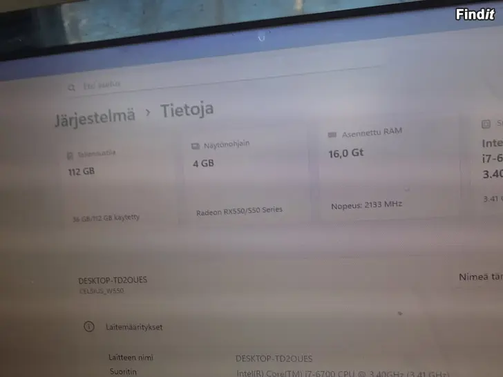 Fujitsu Celsius w550 tietokone pelaamiseen ja työskentelyyn kuvien musiikin muokkaamiseen yms intel i7 6700 4ydin 8 lankanen max 4.0ghz 128gb ssd + 500gb hdd 16gb ddr4 2 paikkaa vapaana win11 Näytön ohjain Radeon Rx 550 4gb intel hd näytön ohjain 530 intergoitu Näytön ohjaimessa hdmi display port dvi emolla dvi vga liitin display port 10 x usb kuuloke liittimet hiiri liittimet Dvd rw Asema joka toimii Hiiri mukaan Näppäimistö mukaan virta johto mukaan kuulokkeet mukaan. Tämä OnFujitsun Työ asema valmistettu Saksassa lappujen mukaan. eli tämä pöytäkone on pikkasen paremmin tehty sa suunitelut ssd ja hdd on helppo vaihtaa. mahtuu parempi näytön ohjainkin. tällä pystyy pelaamaan mutta työ ja koti käyttöön pätevä tietokone Itse olen leffoja katsellu koska kuva on hyvä. nyt alle markkina hintojen mutta tarjouksia silti kuunellaan. nouto ja postitus voin tuodakkin myös posti ennakolla.