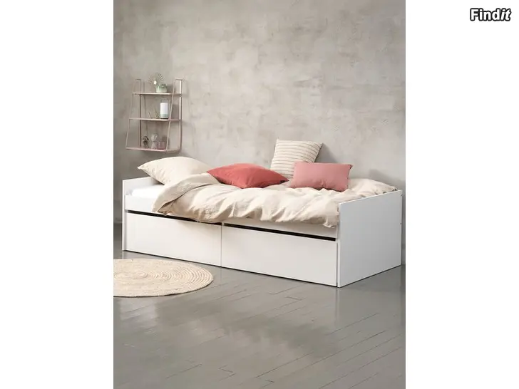 Köpes soffasäng eller säng med låda under, helst Ikea eller Jysk. Tex Hemnes.