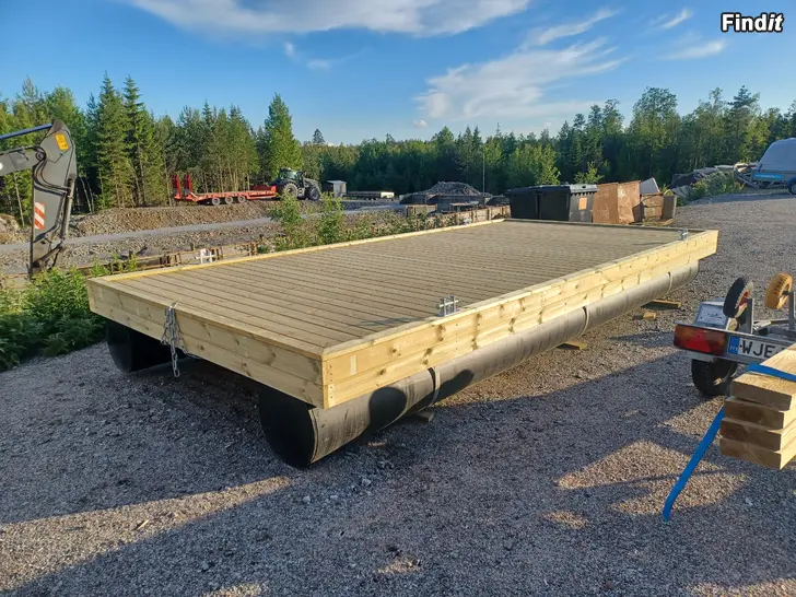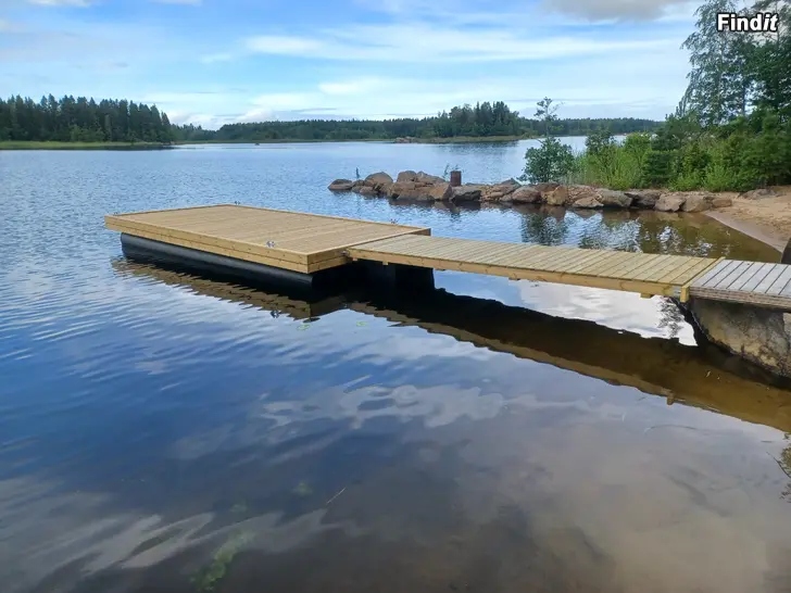 Stadig flytbrygga med rörpontoner. Kan vara i sjön året runt. Landgång med egen flytponton.