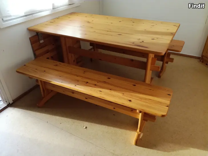 Litet möblemang i furu. Finns tilläggskiva till bordet.