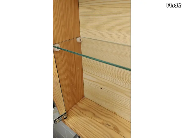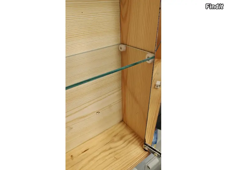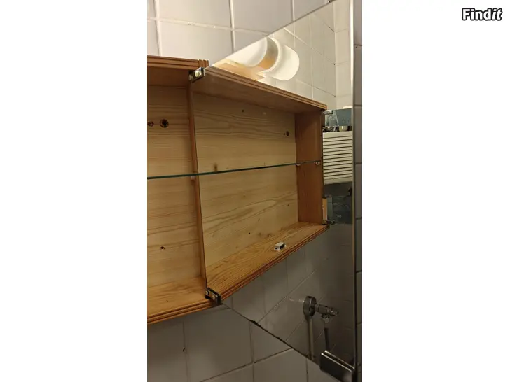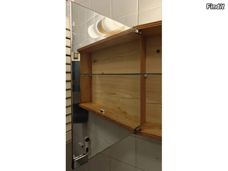 Säljer ett gediget badrumsskåp i ljust massivt trä. Skåpet är i bra skick för sin ålder och har en naturlig patina. Går utmärkt att måla eller slipa om man vill sätta sin egen prägel på det. Dubbla spegeldörrar och en glashylla.