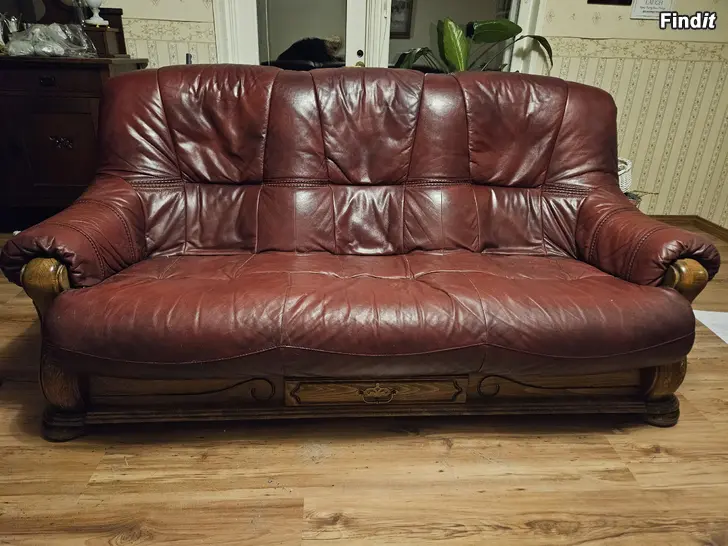 Säljer en soffa och 2 fåtöljer i trä & läder. Stadiga och ännu i gott använt skick. Syns slitage på lädret Finns och hämtas i Kimo