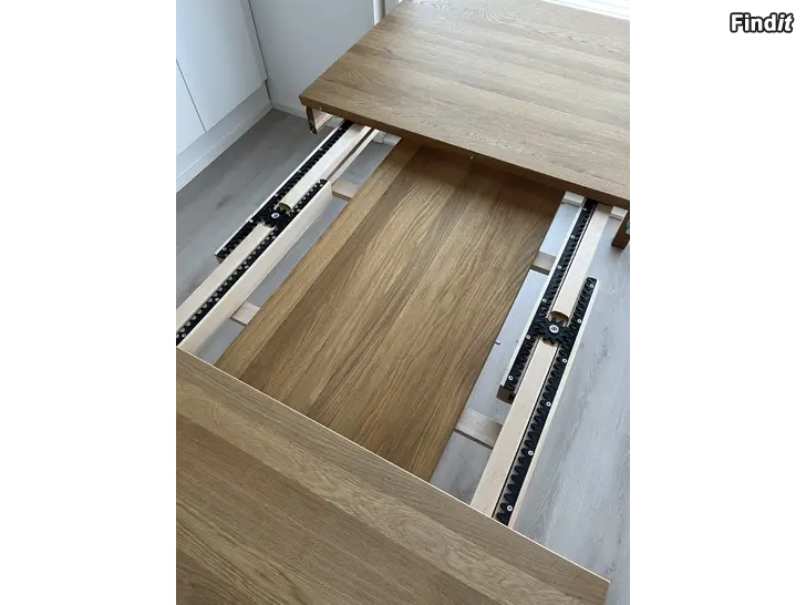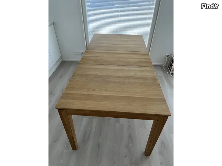 Säljes tidlöst och praktiskt matbord i ek med förlängningsskiva från Pohjanmaan Kaluste. Bordet rymmer 4-8 stolar.