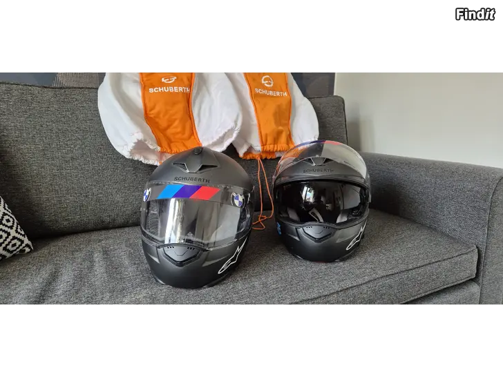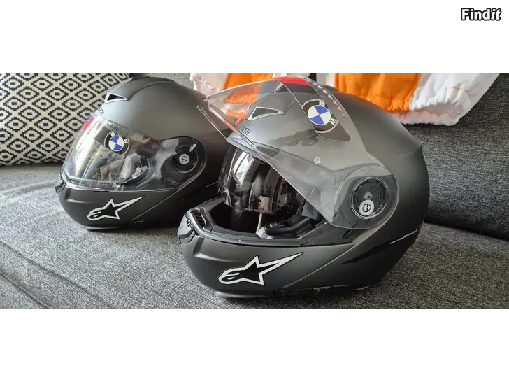 2 stk mc hjälmar med orginal intercom i gott skick. Storlek M 56/57. Hela och rena utan repor. Använda 5 somrar. Säljes skilt 150e, elker som par 250e. Dekaler går att ta bort.