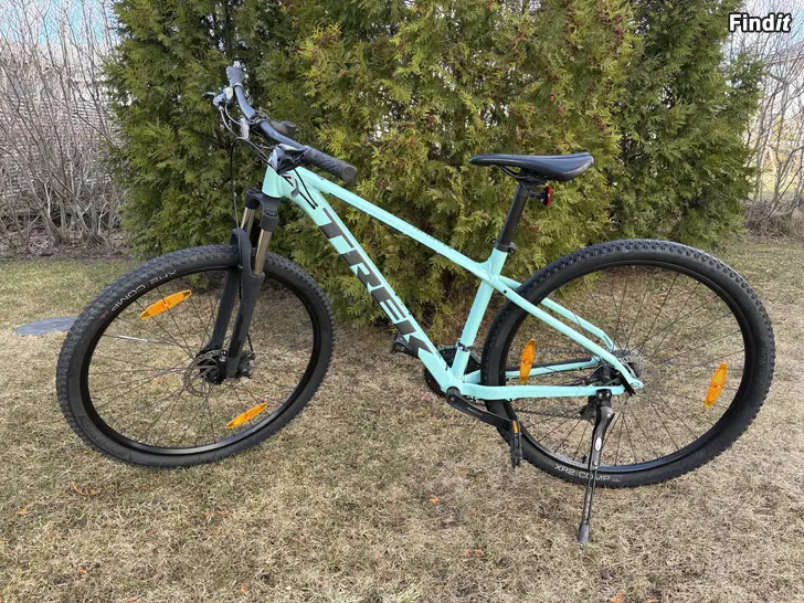 Säljes mountainbike Trek Marlin 4, ramstorlek M 165-177cm, 29, 3x7 växlar, mintgrön, årsmodell 2022. Medföljder stödfot, löstagbara stänkskärmar och ett dubbdäck. Nyligen bytt kedja, kasett och bakbromsvajer.