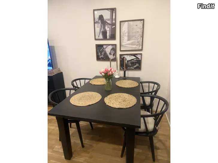Utdragbart matbord. Finns i radhus i smedsby. Benen går att ta löst lätt vid transport. Små märken här och där av användning men inget som stör. Stolarna kommer inte med. 147+skivan 56x95 Kontakta via sms vid intresse!