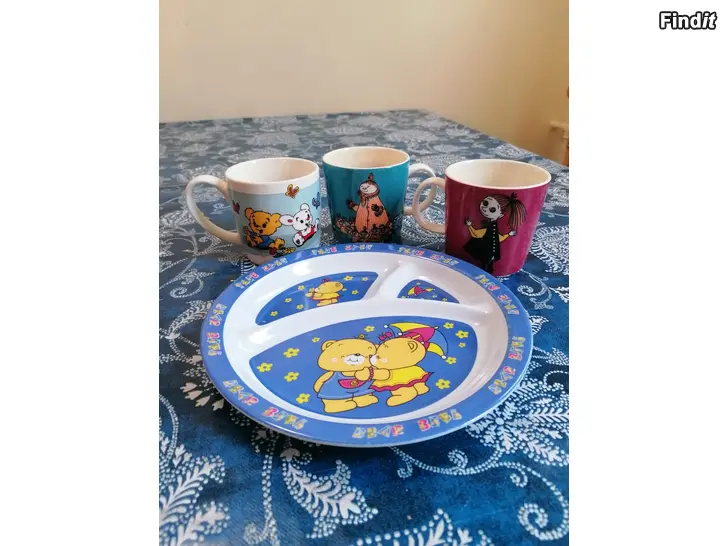 Två begagnade muminmuggar, en ny bamsemugg och en barntallrik. Allt för 15 €