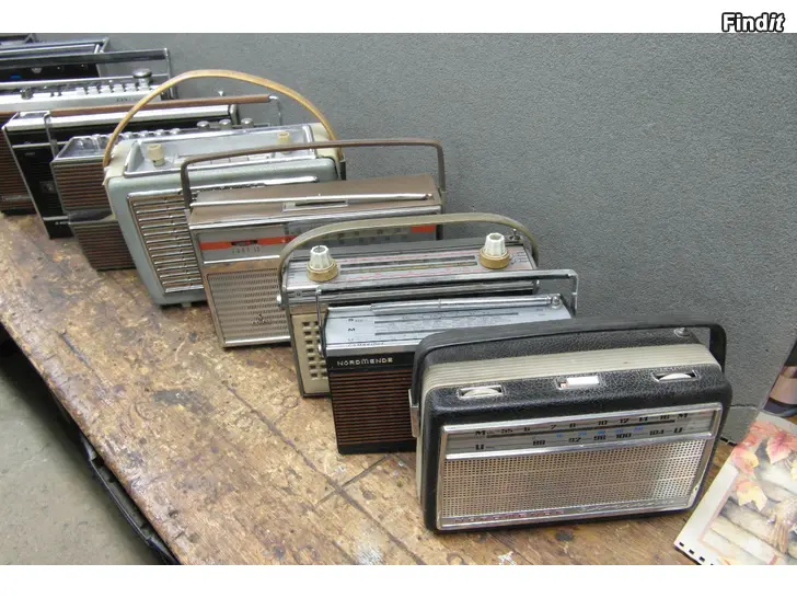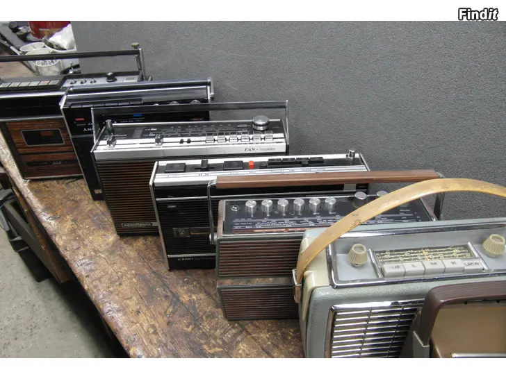 Tälläinen 10 kpl radiokokoelma nyt kaupan. Radiot 60-70 luvulta, osa varmasti toimiikin ja osassa varmasti vikoja osa vain paristo toimisia joten ei ole testailtu kun tarvisi monenlaisia vanhoja paristoja. Säilytetty sisällä kuivassa ja huoneenlämmössä hyllyllä koristeena. Merkit luoteltuna kuvista oikealta vesemmalle: Nordmende Stradella, Nordmende Cambritge, Fenno, Siemens Turf 53, Blaupunkt Derby, Telefunken Camaro 101, Grundig C 2001 automatic, Nordmende Fan Recorder, Sony cassette-corder TC-95A, Hitachi TRK-1260E. Luovun vain koko kokoelmasta kerralla en myy yksittäisiä radioita.