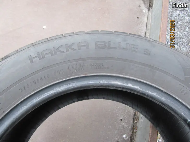 Sommardäck Nokian Hakka Blue 3. 225/55 R 16 XL 99W. Mönsterdjup på samtliga 3+mm. Dessa har ännu en sommar kvar i sig. Finns i Södra Vallgrund men fås till Kvevlax på vardagar.