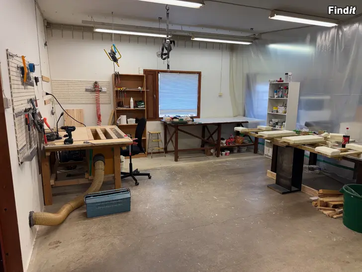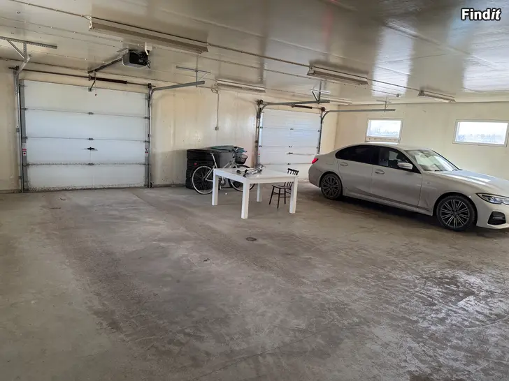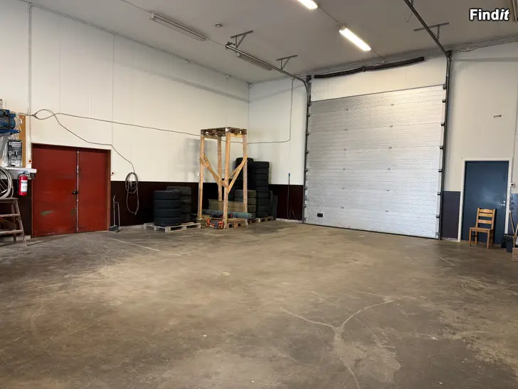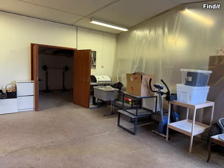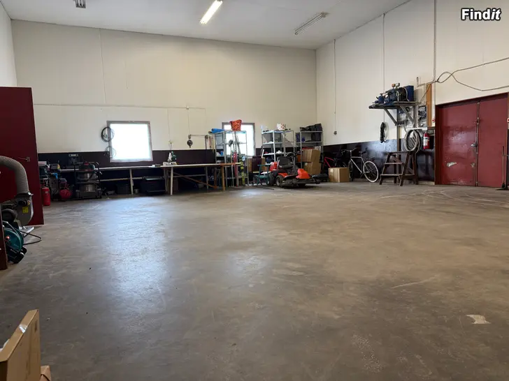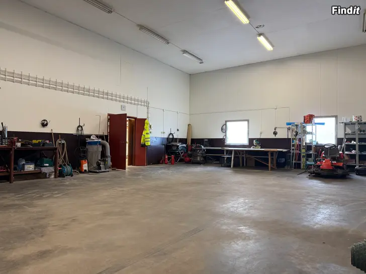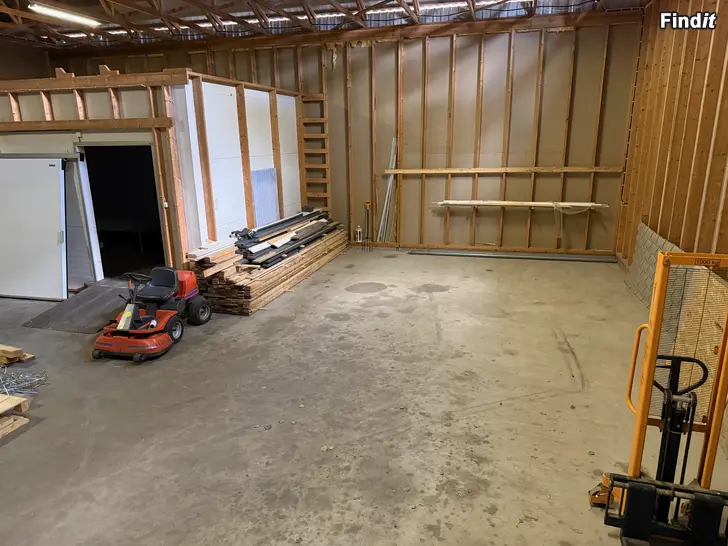 Den höga halldelen är uppdelad i två sektioner, en varm och en kall del. Innertakshjöden är 5 meter. I den lägre halldelen hittas varma verksamhetsutrymmen, kök, wc och garage för 2 bilar.