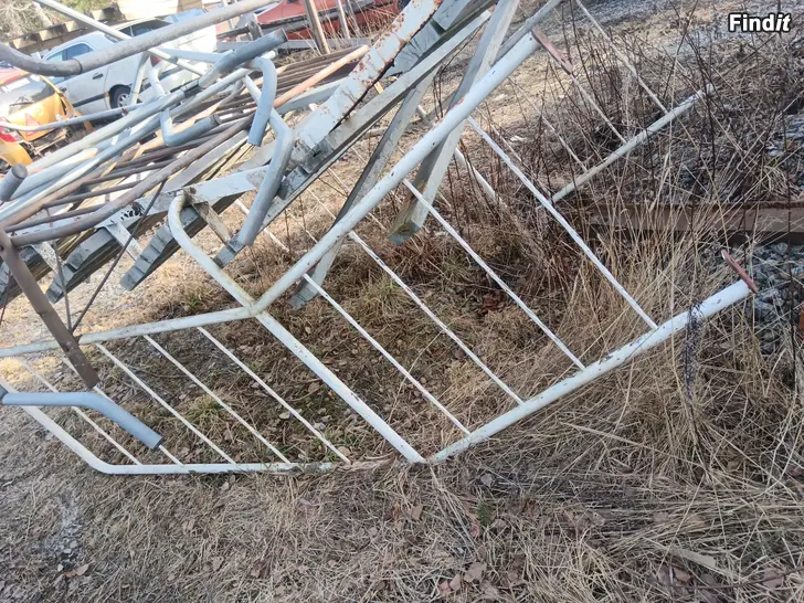 Järntrappstativ med räcken på båda sidorna.,, 5 trappsteg, har inte mätt brädden, och de tryckimpregnerade trappsteg plankorna skall bytas,, tel 0400767223