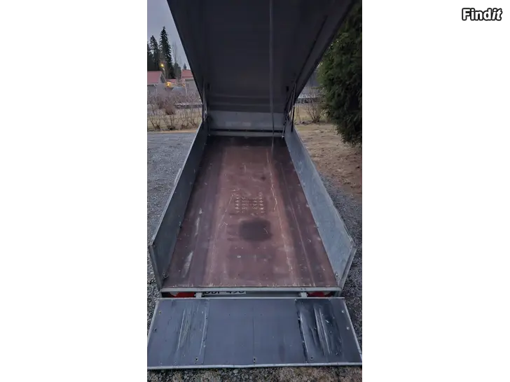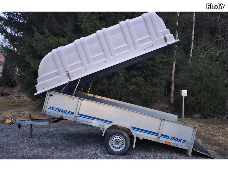 Jt-trailer 350k, tilava kuomukärry kipillä. Lava 150 cm x 350cm Laita 50 cm korkea Sisäkorkeus 150 cm Gansi-kuomu, 100 cm korkea Kestävät led valot edessä ja takana. Kaasujouset kipissä ja kuomun avauksessa. Juuri vaihdettu oikealle puolelle uusi pyörän laakeri.