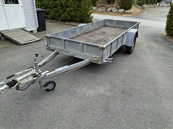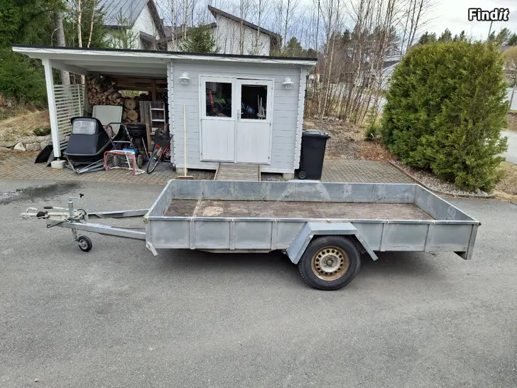 Kraftig och stadig släpvagn byggd på husvagnsunderrede, Besiktad som obromsad 750kg vagn men det finns kvar bromsar som är deaktiverade. Flakmått 350 x 150cm. Stötdämpare och däck i bra skick.