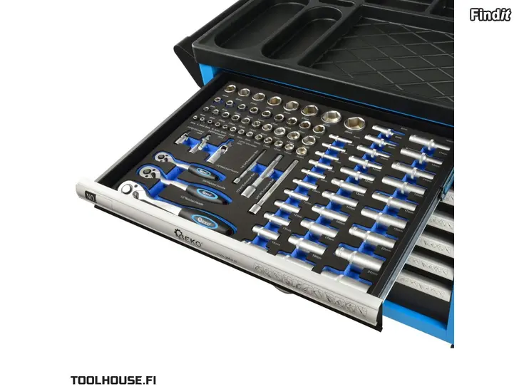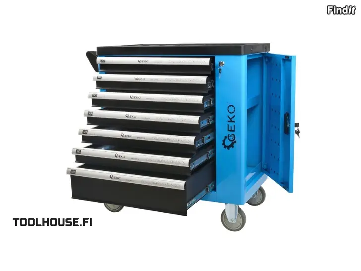 Verktygsvagn med sju lådor och ett skåp på gaveln av vagnen, sex av lådorna är fyllda med 243 st olika verktyg som täcker det största behovet i verkstaden.