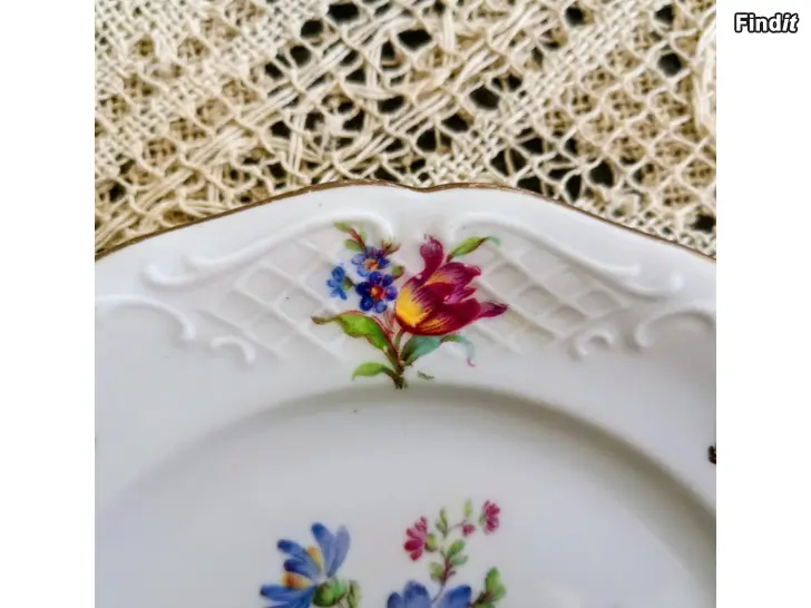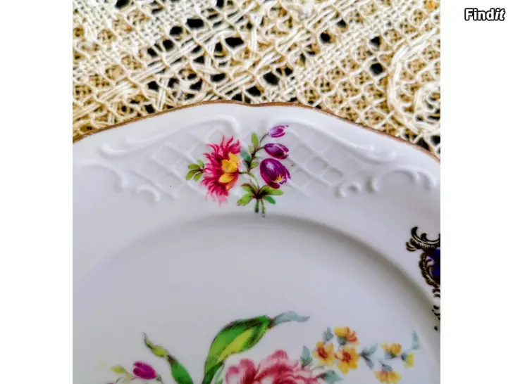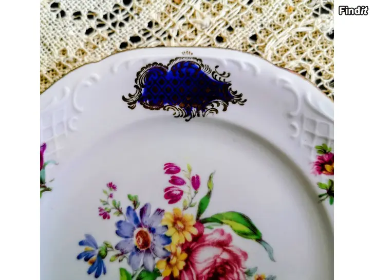 Diameter 17cm Två vackra assietter med klassiskt blommönster och guldkant. Märkta undertill se bild. Mycket gott skick. Inga nagg, sprickor eller krackeleringar. OBS! Frakt Ingår!