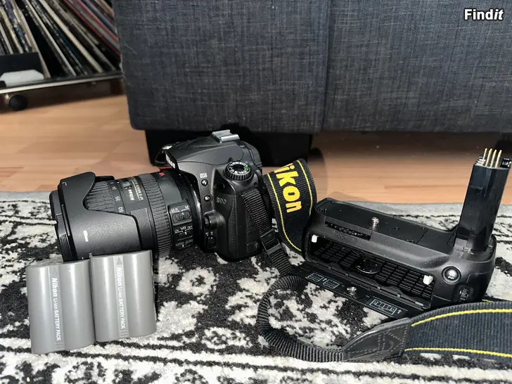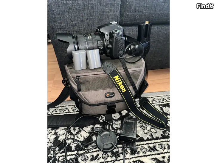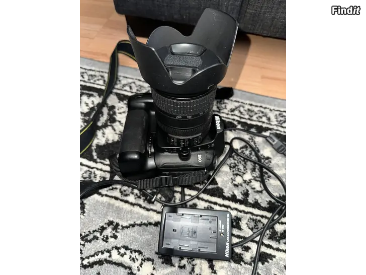 Detta ingår: Nikon D90 kamerahus Nikon 18–200mm VR objektiv Batterigrepp för dubbla batterier och bättre grepp 2 batterier Laddare Kameraväska Lowepro Filter + linsskydd Rem