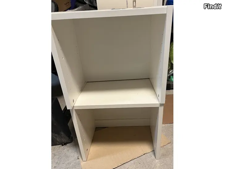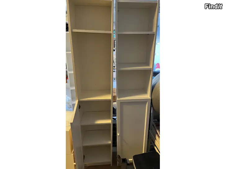 Två hyllor med extra hyllor att sätta överst. Höga hyllorna är 202x40cm. Båda ser likadana ut bakom dörrarna. Extra hyllor 35x40cm. Har spår av användning och behöver torkas av innan användning. Säljes som paket. Finns i Böle, Korsholm.