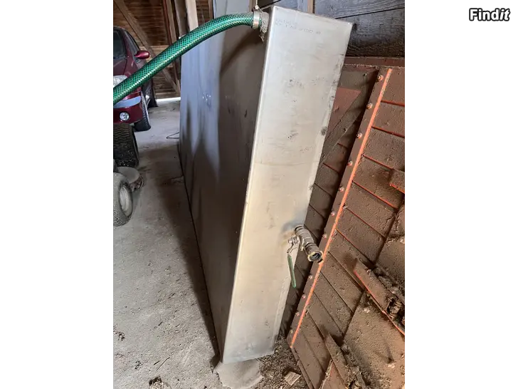 Rostfri vattentank med kran som bra går att ha på släpvagn måtten är längd 250 cm , bredd 110 cm och höjd 20 cm