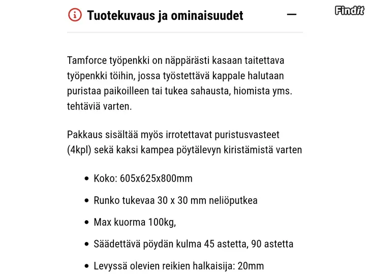 Tamforce työpenkki on näppärästi kasaan taitettava työpenkki töihin, jossa työstettävä kappale halutaan puristaa paikoilleen tai tukea sahausta, hiomista yms. tehtäviä varten.