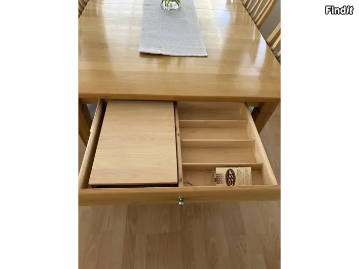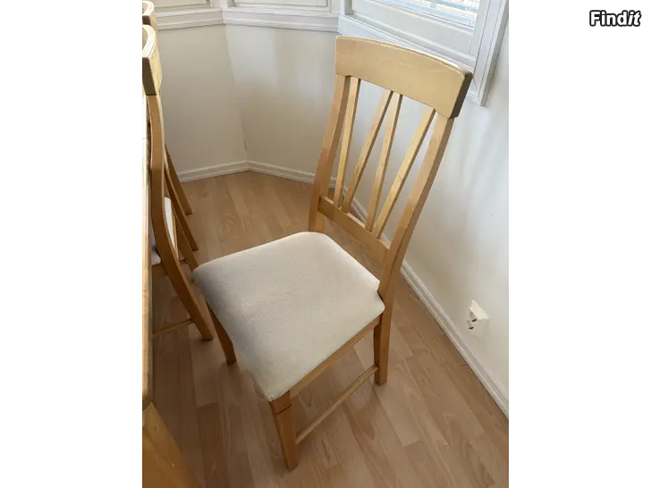 Esse möbel bord + 6 stolar, stabilt bord, men finns skråmor. Värmebehandlad björk, finns tilläggsskiva. Mått 170x103 cm, tilläggsskiva 45 cm. Bordsytan har blekts så tilläggsskivan är mörkare.