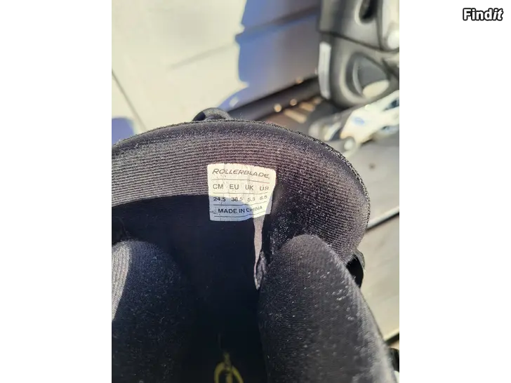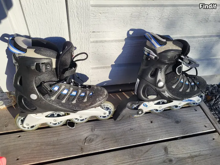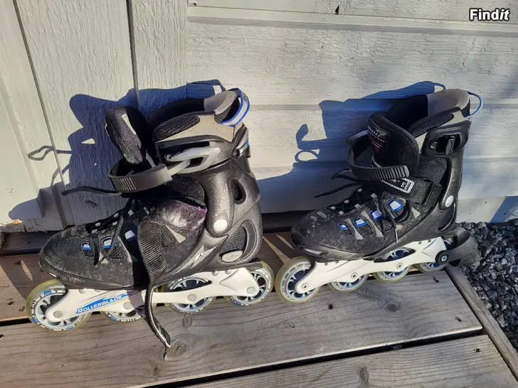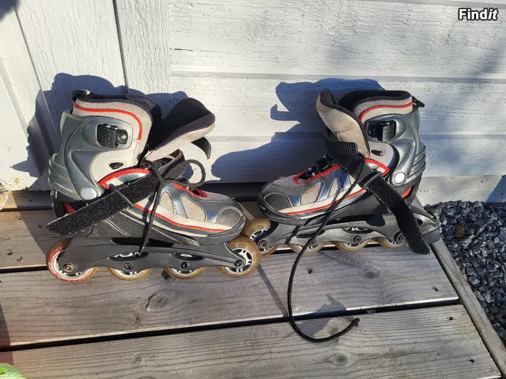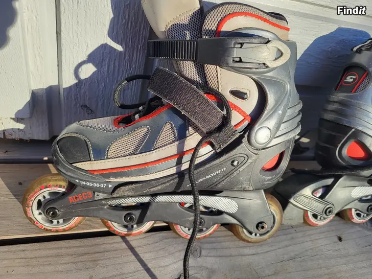 Rullskridskor som är ställbara, storlek 34-37. På köpet får man ett par 38,5 som fungerar men kräver tvätt.