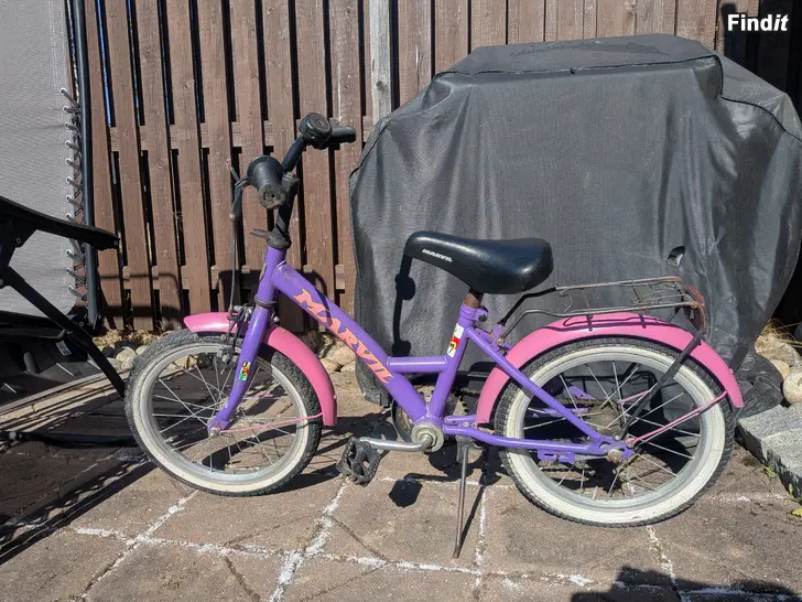 16 cykel, pyspunka på framhjulet. Annars i skick, sadeln hel, finns rost så e räcker.