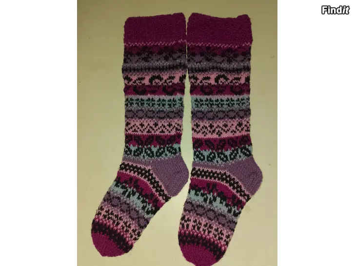 Kirjoneulesukat 7 veljestä langasta. Varren mitta 38 cm ja jalkaterä 26 cm. Postikulut tarvittaessa 4e Postin S-kokoisessa paketissa manner-Suomen alueella. Samaan pakettiin mahtuu myös muutakin.