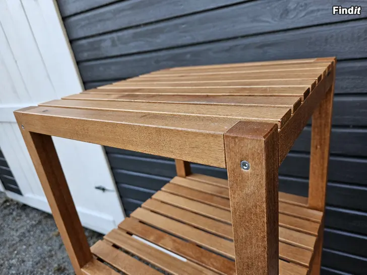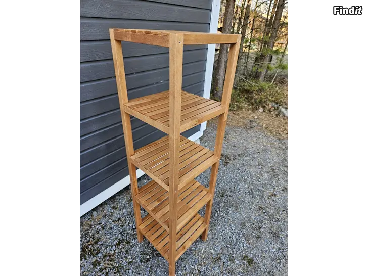 Stadig hylla i brunt trä säljes som obehövlig. Den är 37 cm bred och 37 cm djup samt 139 cm hög. I gott skick!
