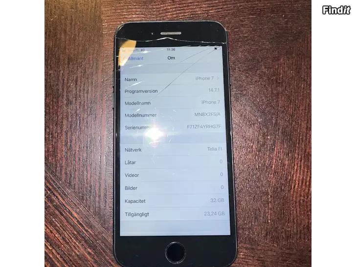 Säljes en iPhone 7 skärmen lite spruken men fungerande ändå pris 20€ fungerar bra som extra telefon
