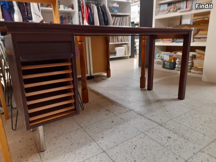 Mörkbrun skrivbord med uppdragen dörr. Som innehåller 8 brevkorgar.