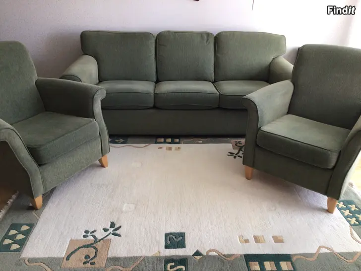 Tre personers soffa, två tillhörande fåtöljer samt matchande matta, allt i grön nyans. Kvalitet möblernas nypris 3000 - 4000 euro.