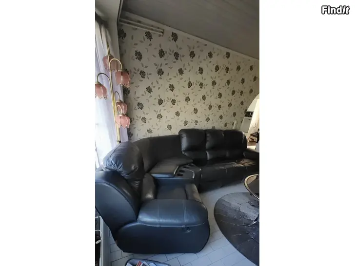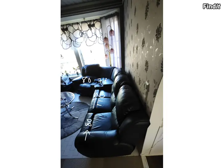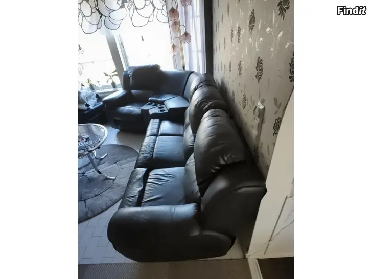 Svart läder soffa i gott skick säljes. 4 sittplatser + hörndel med kopphållare och förvaringsutrymme. Soffan går att bygga som man vill. 2 platser med mekanism som fungerar. Finns 2 st revor, ca 5 och 3 cm på baksidan av soffan. Måtten finns på sista bilden. Finns i Korsholm/Toby.