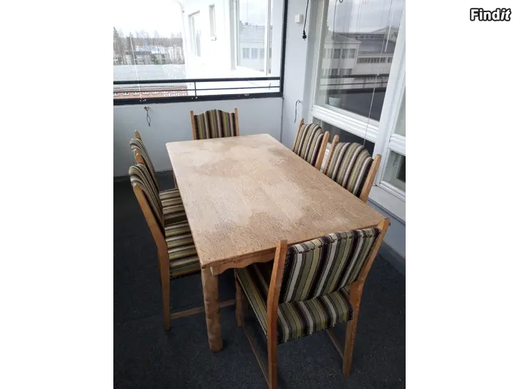 Myytävänä ruokailu ryhmä. Pöytä ja 6 tuolia. Pöydän koko 155 x 80 cm + jatkopalat päätyihin 2 x 40 cm. Jatkopalat kätevästi pöydän alla. Kohtuu kuntoiset. Luultavasti tammea. Tanskalaista laatu työtä. Ylimääräiset tarjoa.