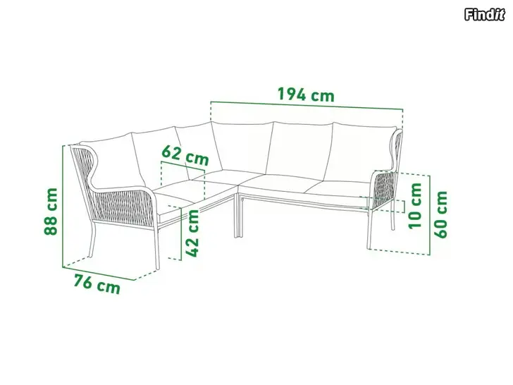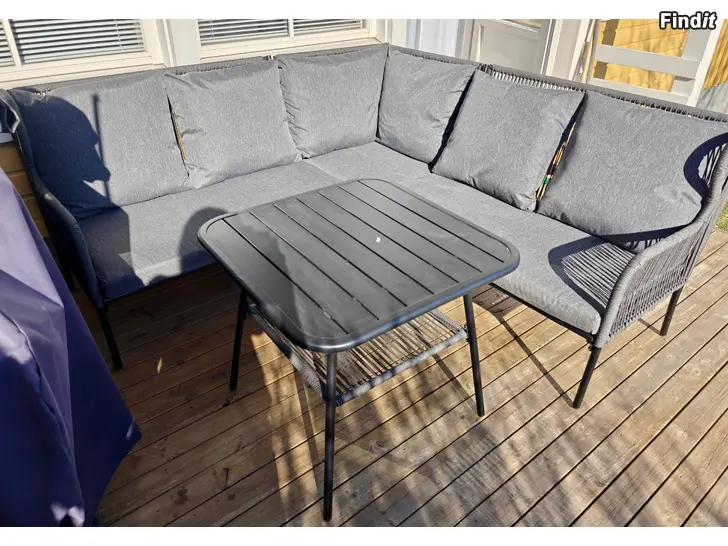 Trädgårdssoffa och bord till salu. Setet är sparsamt använt en sommar, så allt är i mycket bra skick. Utomhus har soffan alltid haft ett möbelskydd på fås med. Kuddarna har förvarats inomhus vintertid.