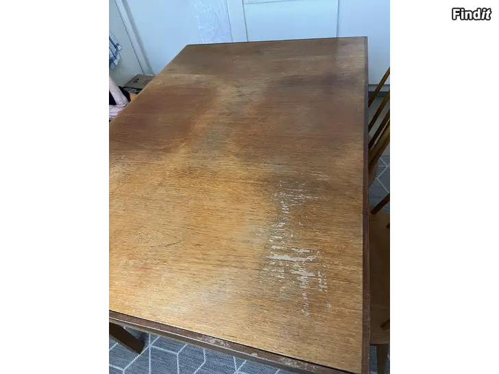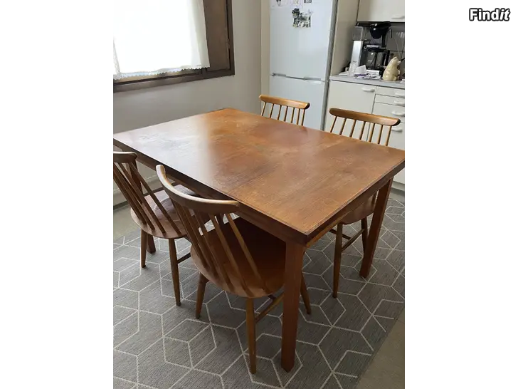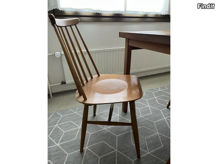 Stadiga Fanett-pinnstolar från 60-talet är tillverkade av Edsby Verken, Sverige, stämpel under sittdelen. Bordet saknar stämpel, annan tillverkare, bordsskivan behöver åtgärdas.