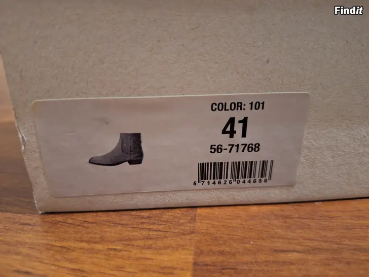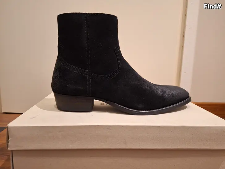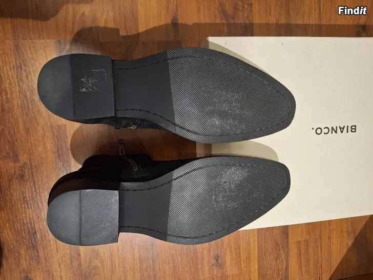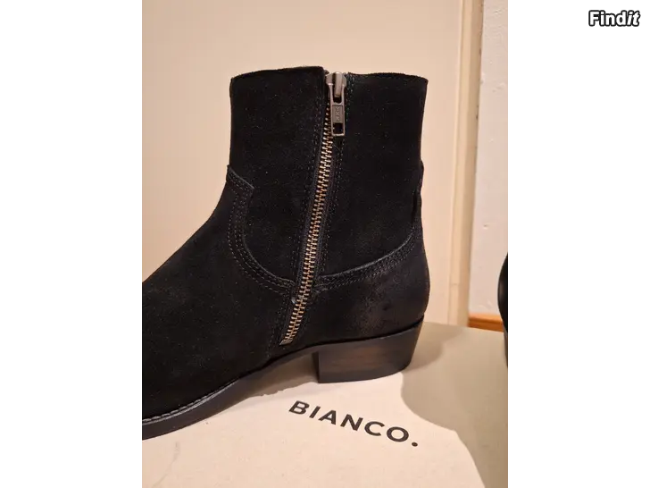 Myytävänä todella tyylikkäät, mustat mokkanahkaiset Bianco-saappaat. Uudet, käyttämättömät nilkkurit, joissa vetoketjukiinnitys sisäsyrjällä. Kokomerkintä 41 ja suuntaa-antavaksi pituudeksi mittasin noin 28 cm. Kengät valmistettu Portugalissa. Alkuperäisen kenkälaatikon ansiosta lähettäminenkin onnistuu.
