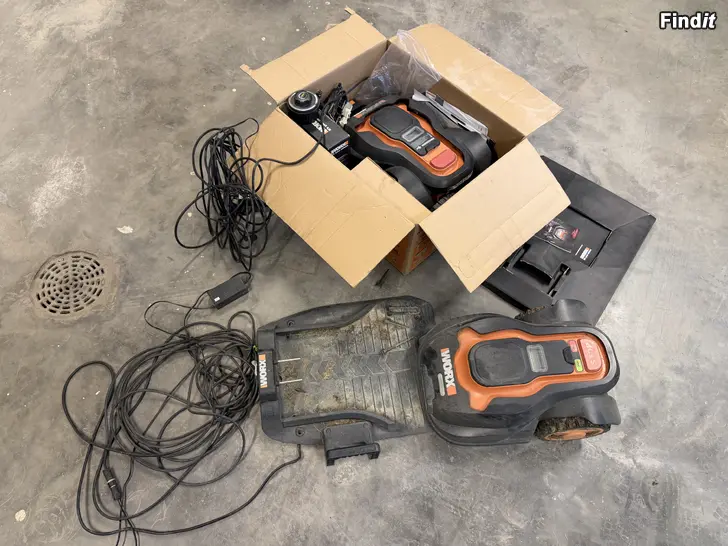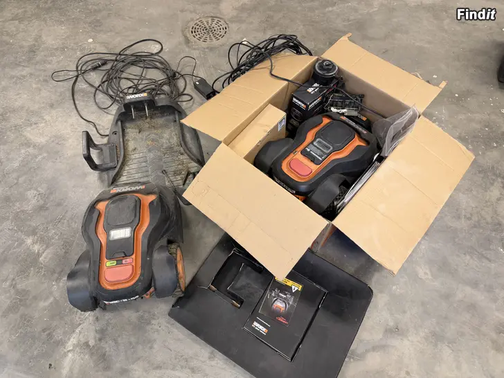 Två Worx robot klippare, en som fungerar och en reservdels donator, 2 st laddstationer med fungerande PSU och en del installationsmaterial. Prisförslag 100€ för allt.