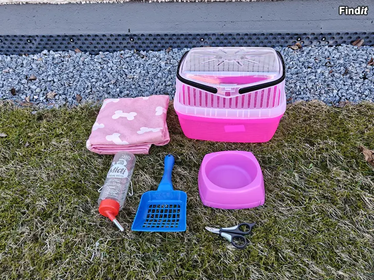 Bur.Liten transportbur.Matkopp.Vattenflaska.Liten handduk/filt.Nagelsax.Liten skyffel.