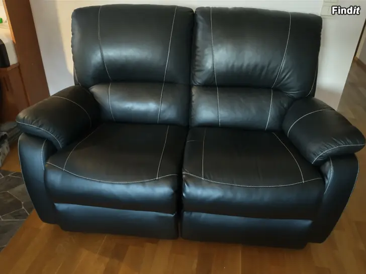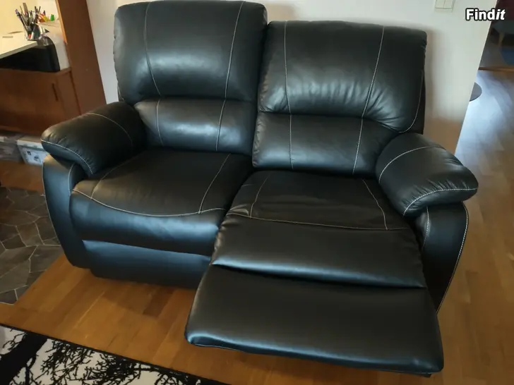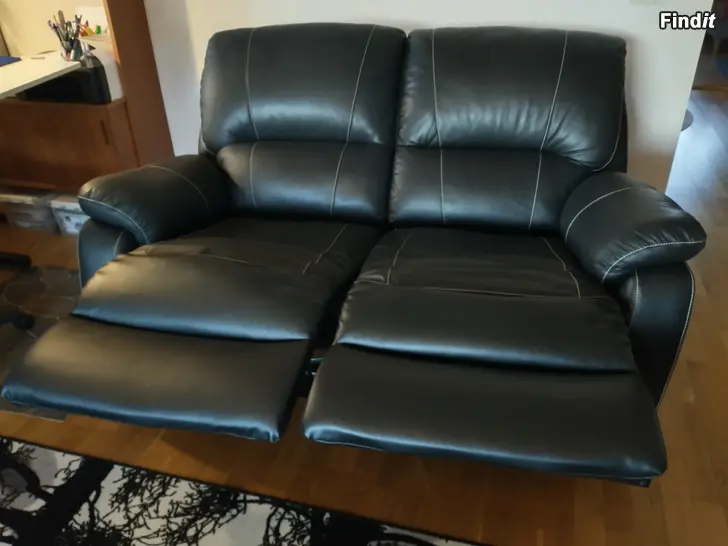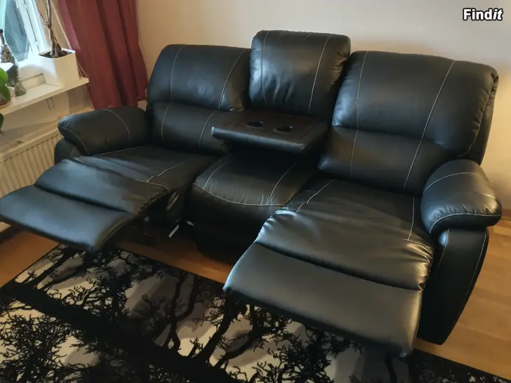 Säljes två svarta soffor med recliner-mekanismer. En 2-personers med två recliner-mekanismer och en 3-personers med två recliner-mekanismer och bord i mitten. Mekanismerna kan användas individuellt. Säljes tillsammans. Pris 500€