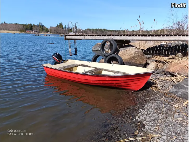 I bra brukskick mindre motorbåt med en 4 hästars motor som är medkörd ca 4 timmar har stått i förråd i 17 år. Motorn är som ny och fullständigt servad. Båten troligen en askeladden ca 4 meter lång, fixade skavankerna förra sommaren så båten är i bra skick. Köl järnet i syrafast stål. Byte till något kul..